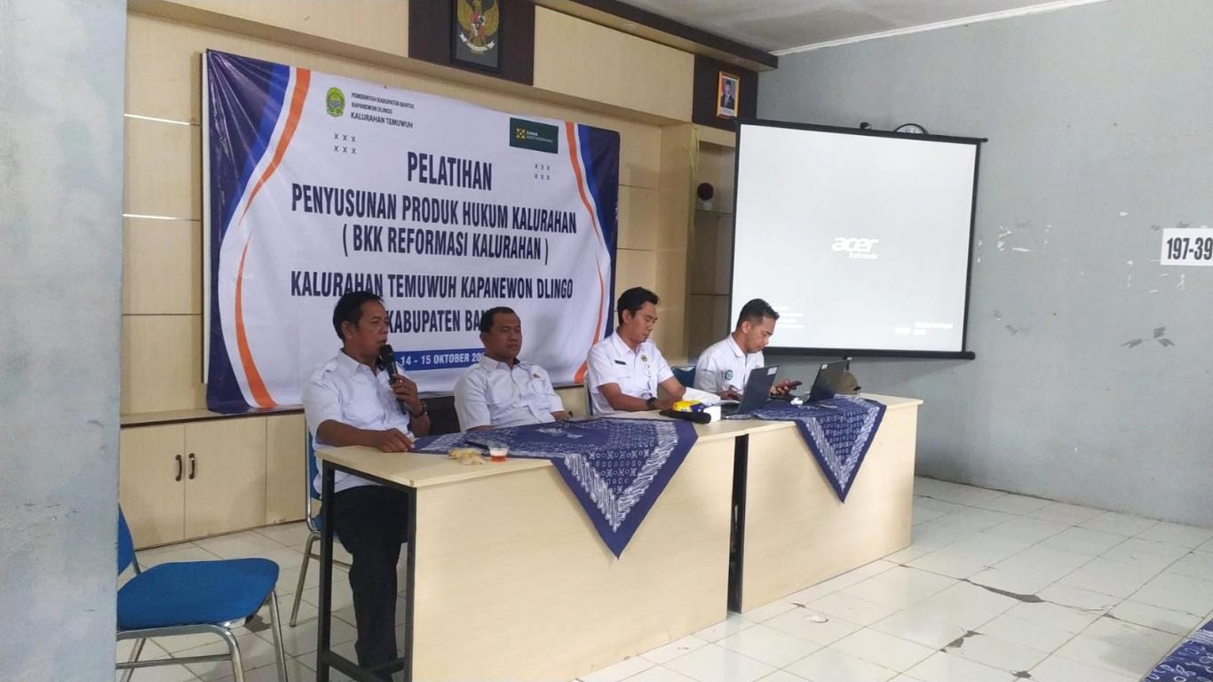 Program Reformasi Kalurahan tahun 2025 di Kalurahan Temuwuh yang bersumber dari Dana Keistimewaan meliputi beberapa kegiatan. Salah satu kegiatan Reformasi Kalurahan ini adalah Pelatihan Penyusunan Produk Hukum Kalurahan. Kegiatan ini dilaksanakan 2 hari yati tanggal 14 dan 15 Oktober 2025. Peserta kegiatan ini terdiri dari Lurah, Pamong, Bamuskal, dan staf di kantor kalurahan. Peserta menerima materi tentang serba-serbi produk hukum kalurahan, teknis penyusunan Perkal, Perlur, SK Lurah dll.