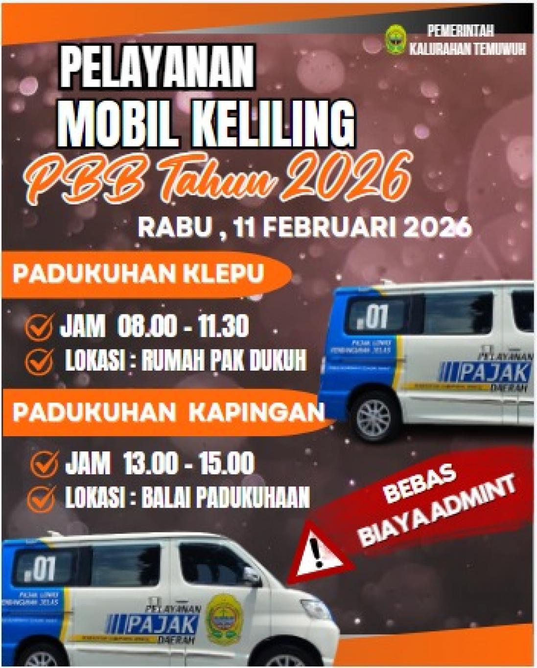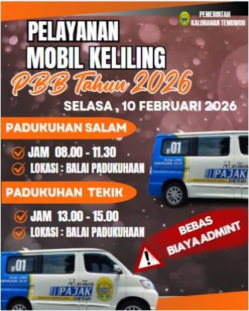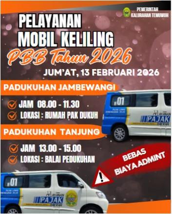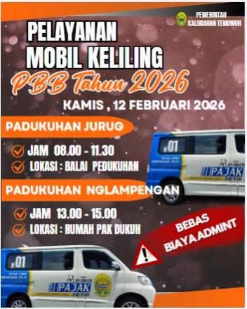 Monggo warga masyarakat Temuwuh, kami sampaikan jadwal Pelayanan Mobil Keliling pembayaran PBB tahun 2026. Pastikan anda membawa SPPT sesuai obyek pajak anda. Manfaatkan kemudahan pelayanan ini. Moling PBB membantu masyarakat dengan mendekatkan layanan pembayaran langsung ke padukuhan atau kalurahan, menghemat waktu dan biaya transportasi warga. Layanan "jemput bola" ini mempermudah pelunasan SPPT PBB.