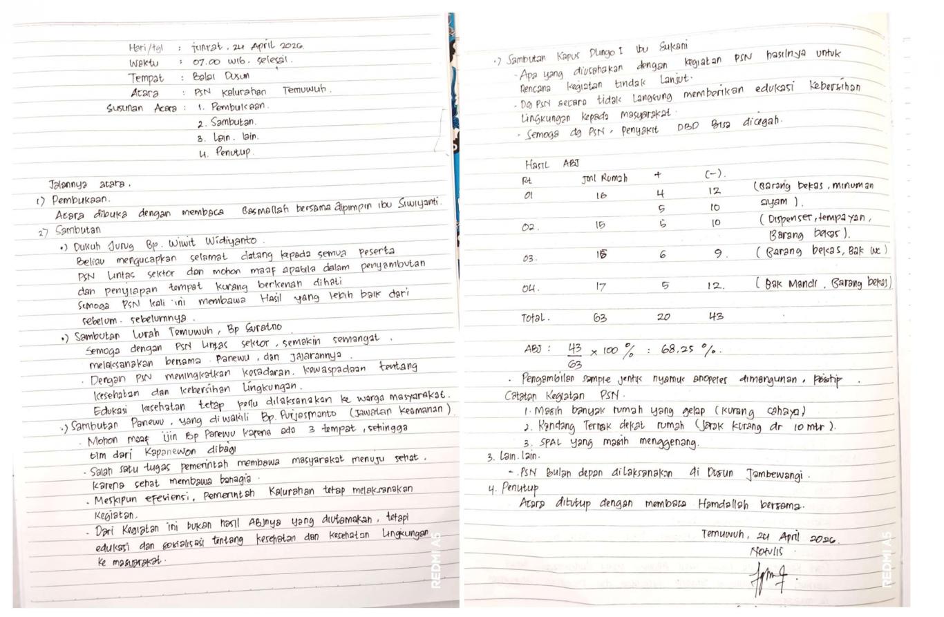 Musim hujan sudah akan berakhir. Namun demikian ancaman DBD senantiasa ada. Jumat, 24 April 2026 kader PSN Temuwuh mengadakan kegiatan PSN bersama Forkompinkap Dlingo dan Puskesmas Dlingo 1 di Padukuhan Jurug, Kalurahan Temuwuh. Efisiensi anggaran dari Pemerintah Pusat tidak boleh menjadikan kegiatan PSN terhenti, begitu penuturan Bp. Purjasmanto (Kawat Keamanan) selaku wakil dari Bapak Panewu Dlingo. Dari kegiatan PSN ini didapatkan ABJ 68,25%. Ini menunjukkan masih banyaknya ditemukan jentik-jentik nyamuk di lingkungan rumah warga masyarakat. Ban bekas, tempat minum ayam, barang bekas, bak air merupakan tempat yang masih ditemukan bagi nyamuk untuk berkembang biak.
