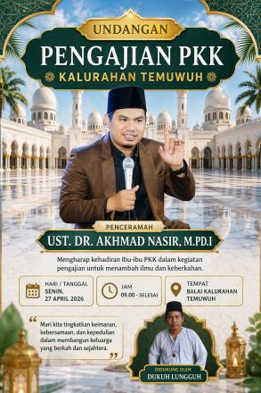 “Hati-hati dengan ucapan, karena ucapan adalah doa”, seperti itu kira-kira garis besar materi pengajian Ustadz Dr. Ahmad Nashir dari Giriloyo pada Pembinaan PKK Kalurahan Temuwuh, 27 April 2026. Ustadz Dr. Ahmad Nashir sendiri merupakan putra dari KH Asmuni Abdurrahman dari Giriloyo yang sudah sering berdakwah di Kapanewon Dlingo. Pada kesempatan pengajian pembinaan keruhanian PKK kali ini beliau menyampaikan untuk berhati-hati terhadap ucapan untuk diri sendiri, ucapan untuk anak, ucapan untuk pelayan/mita kerja dan ucapan terhadap harta. Karena sejatinya ucapan tersebut adalah doa. Jika ucapannya yang baik-baik maka yang akan datang adalah kebaikan. Sebaliknya, jika ucapan yang keluar adalah yang buruk-buruk maka yang akan datang adalah keburukan.